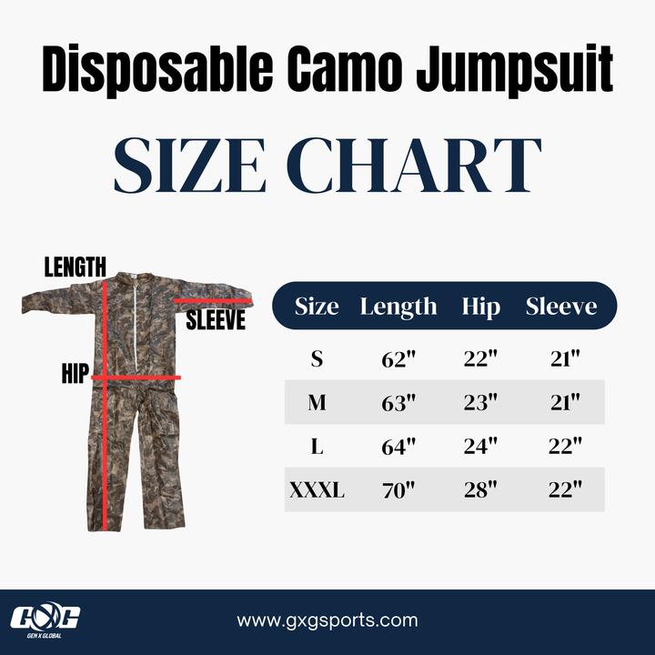 The GXG Disposable Camo Jumpsuit offers durable, lightweight coverage. Designed to protect your clothing during game play. Built for comfort and mobility, this versatile protective suit moves with you while providing a strong barrier against paint, dust, and other contaminants.